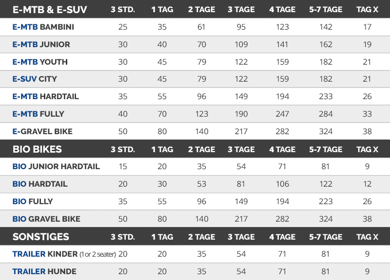 | Verleihstart ist immer der 1. Miettag 09:00 | Abholung am Vortag nicht möglich (Bikeservice uvm.) | kostenlose Storno bis 72 h vor Verleihstart | Preise in Euro & inkl. MwSt.